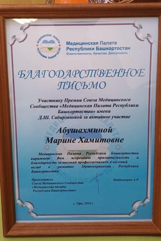 Заведующая кардиологическим отделением Туймазинской ЦРБ Абушахмина Марина Хамитовна получила Благодарственное Письмо Участника Премии Союза Медицинского Сообщества и «Медицинской Палаты Республики Башкортостан» имени Д.Ш. Сабирзяновой за активное участие.